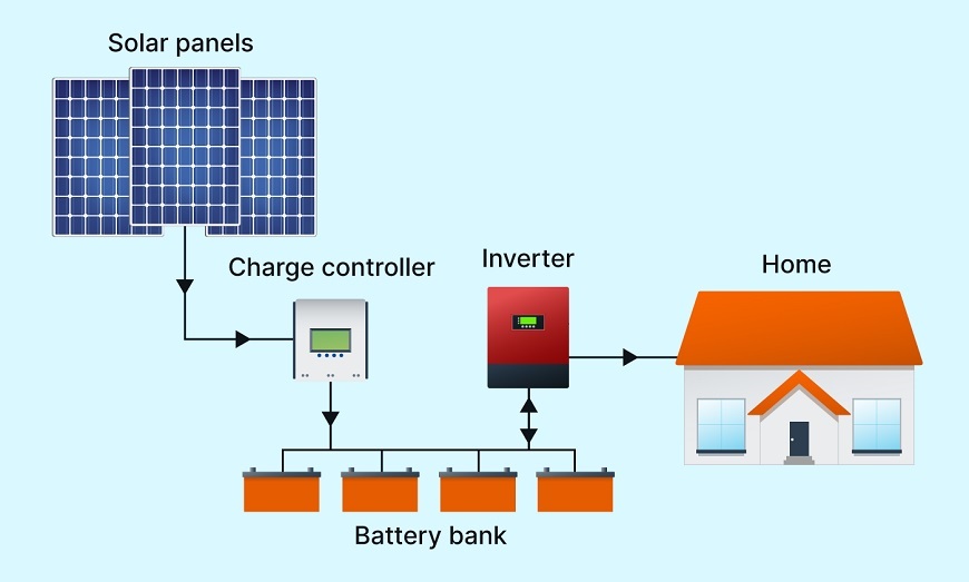 Đối với cách ghép nối DC, bạn chỉ cần lắp thêm pin lưu trữ và bộ điều khiển sạc mà không cần trang bị thêm biến tần riêng cho pin. Dòng điện một chiều từ các tấm năng lượng sẽ chảy trực tiếp vào pin lưu trữ thông qua bộ điều khiển sạc. Sau đó đi qua biến tần và chuyển thành điện AC cung cấp cho các thiết bị điện. Với phương pháp này, pin lưu trữ sẽ được lắp ngay sau các tấm pin mặt trời và điều khiển sạc.