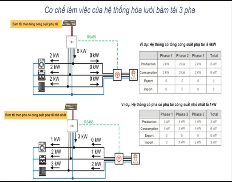 *Ví dụ: Hệ thống NLMT 3 pha CS 9kWp, CS tiêu thụ của tổng phụ tải ở 3 pha là 6kW, mỗi pha là 2kW thì biến tần sẽ điều chỉnh công suất phát điện mặt trời là 6kW chia đều cho mỗi pha 2kW. Được gọi là bám tải theo tổng CS tiêu thụ của phụ tải ở 3 pha.